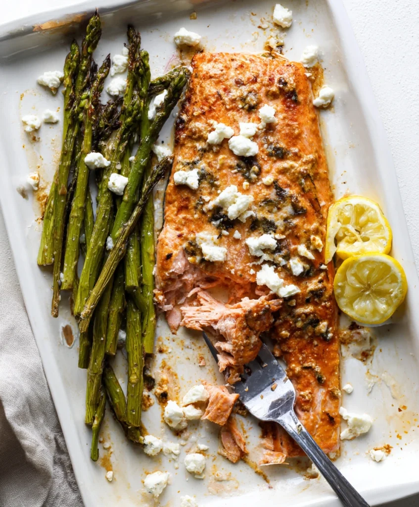 6. Add Feta & Serve: Carefully remove the sheet pan from the oven. Immediately sprinkle the crumbled feta cheese over the hot salmon and asparagus. The heat will slightly soften the feta – divine!
